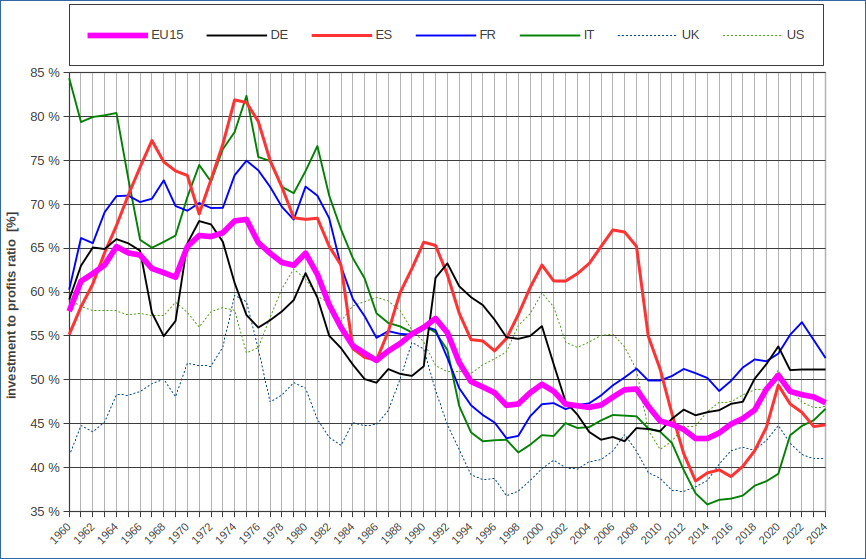 Evolution of the ratio of gross investment to total domestic surplus (defined as gross operating surplus plus taxes minus subsidies on production; source: AMECO database, zamheifa 2024)
