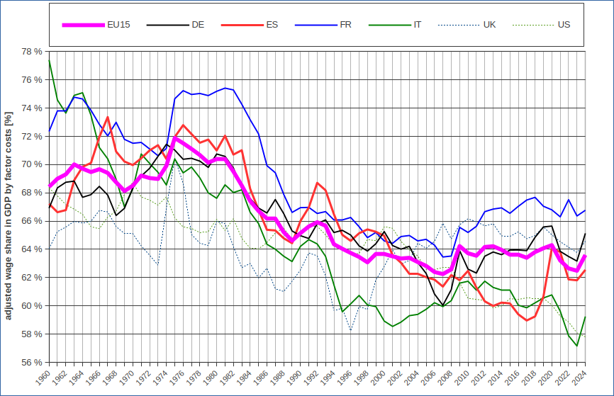 - since the transition from fordist growth regime to neoliberalism around 1980 there is a substantial change in primary distribution of income towards a growing share of capital income (profits) with respect to labour income (wages), from an adjusted wage share of 70 – 75 % in Western Europe in 1980 to 59 – 67 % in 2024, a loss of almost 10% of GDP.