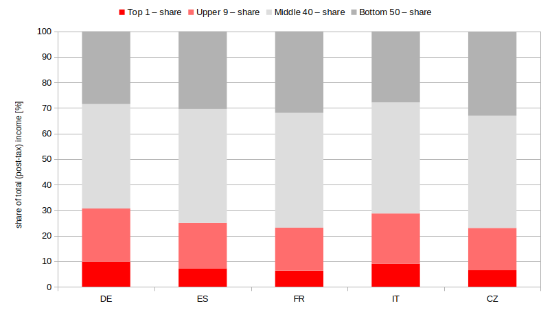 - The upper 10% of the population in 2020 receives from 23 to 31% of total income (post-tax disposable income + in-kind transfers) and the upper 1% have a share of 6,5 to 11%.